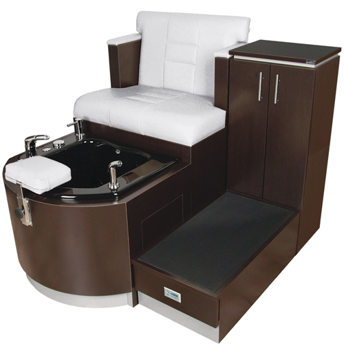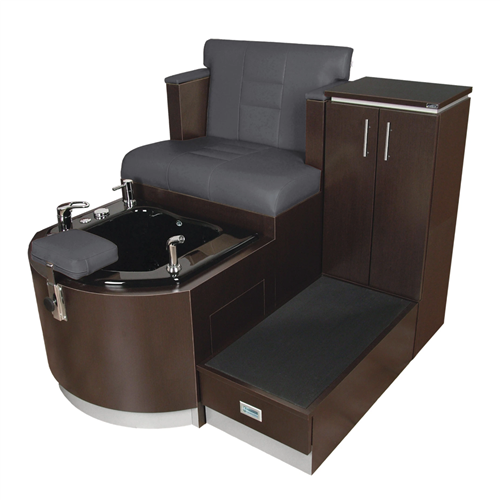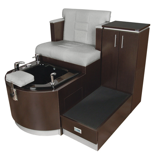The Kelsea Pedicure Unit features a large soaking tub, as well as side storage. This unit comes with the stainless-steel soaking tub shown in the detail image. Also pictured is the acrylic version. Acrylic models are available in pipeless and whirlpool versions.