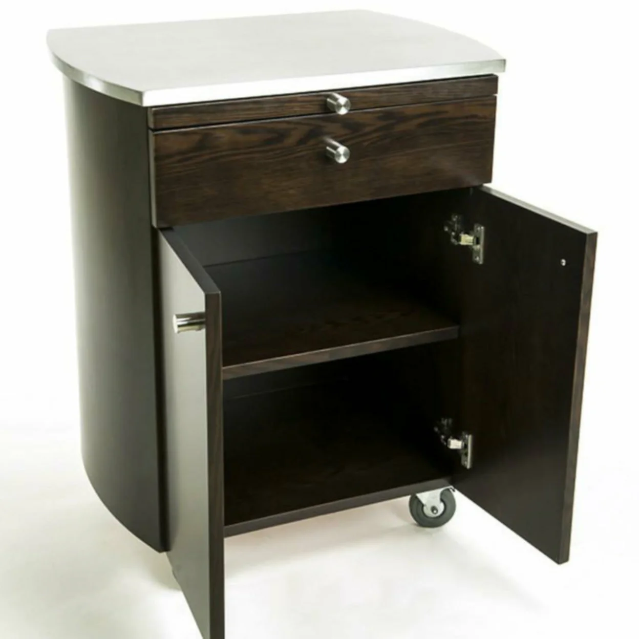 Attractive and functional, this rolling cabinet is easily moved for convenient use in treatment rooms. Stainless steel top, stainless steel pull-out work shelf, full extension drawer, and cabinet with adjustable shelf. Attractive wood veneer will complement any decor. Locking casters.